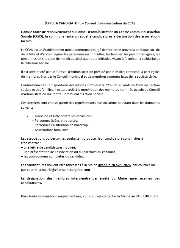 Infos mairie Posted onavril 3, 2026Authorpole animation APPEL A CANDIDATURE – Conseil d’administration du CCAS